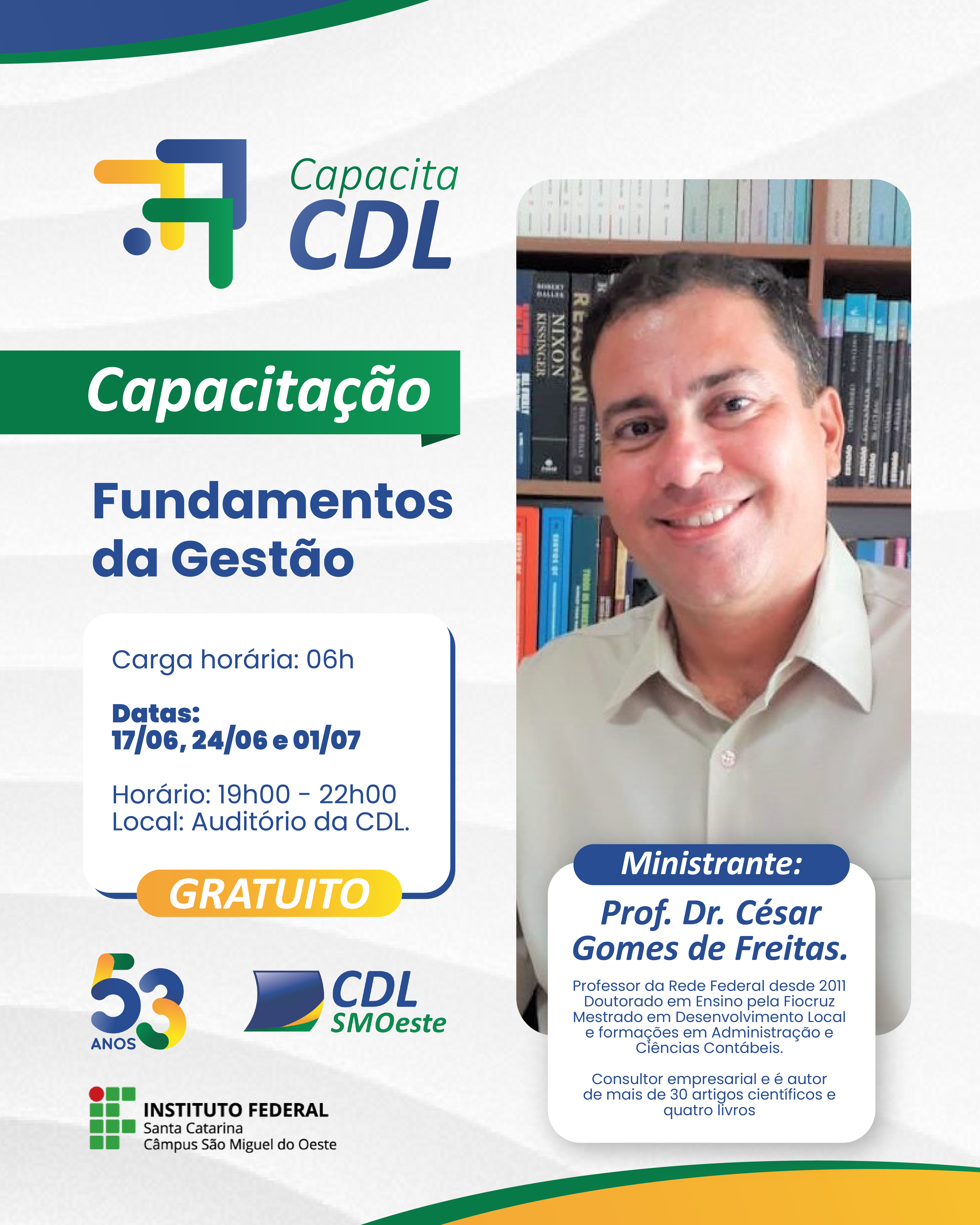Prof. Dr. César Gomes de Freitas é Pós-Doutor em Desenvolvimento Regional e Agronegócios , com ampla formação acadêmica que inclui Doutorado pela Fiocruz e Mestrado em Desenvolvimento Local.