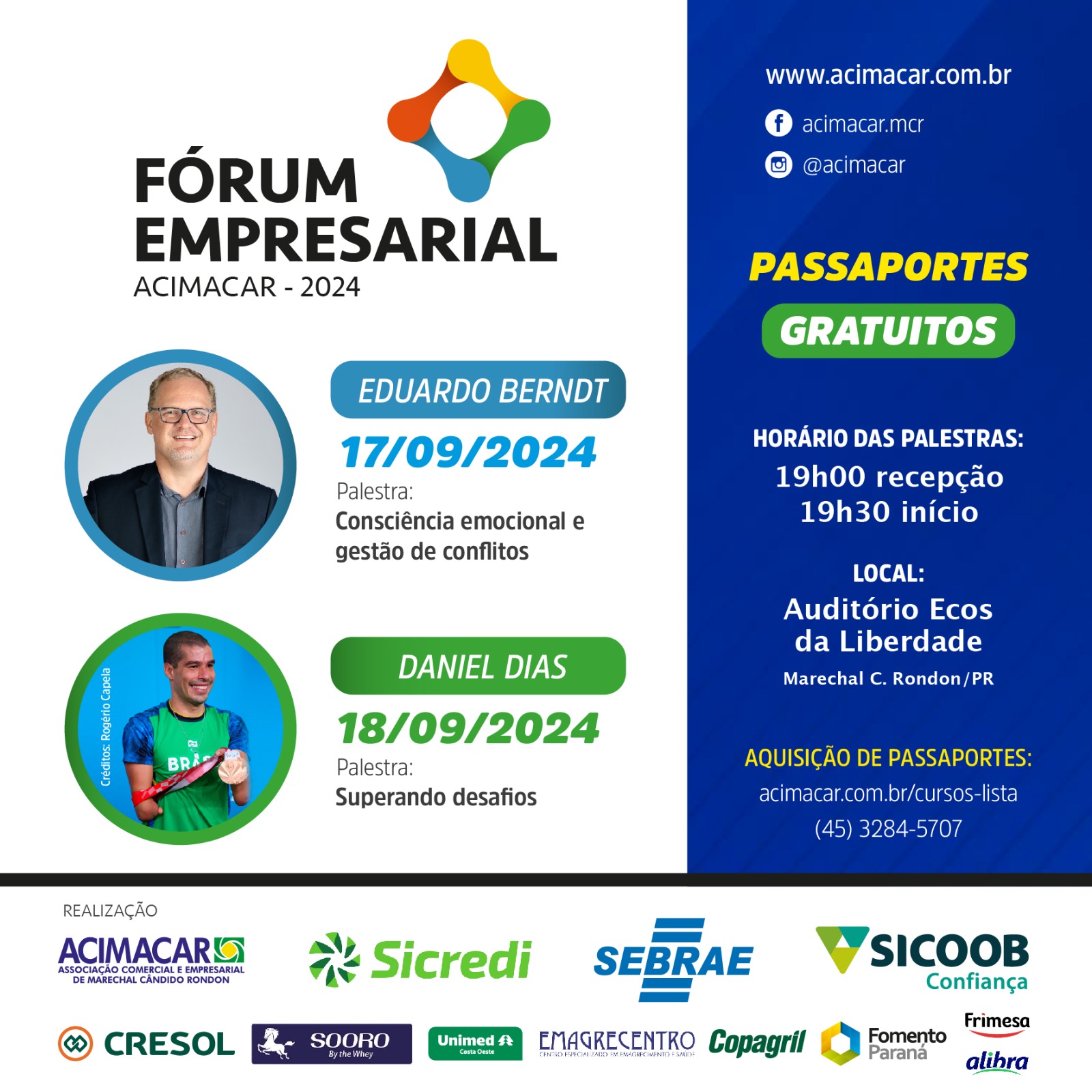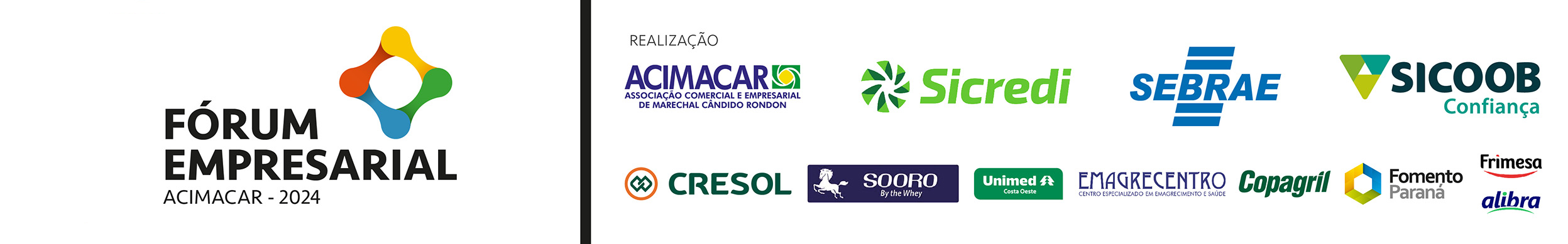 Parceiros: Sicredi Aliança PR/SP, Sebrae PR, Sicoob Confiança, Cresol Integração, Sooro Renner, Unimed Costa Oeste, Emagrecentro Centro Especializado em Emagrecimento e Saúde, Copagril, Fomento Paraná, Frimesa e Alibra Ingredientes.